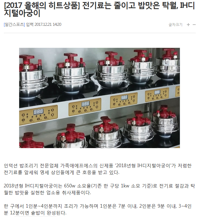 Àδö¼Ç ¹äÁ¶¸®±â Àü¹®¾÷ü °¡Á·¾Ö¿¡ÇÁ¿¡½ºÀÇ ½ÅÁ¦Ç° '2018³âÇü IHµðÁöÅоƱÃÀÌ'°¡ Àú·ÅÇÑ Àü±â·á¸¦ ¾Õ¼¼¿ö ¿µ¼¼ »óÀε鿡°Ô Å« È£ÀÀÀ» ¹Þ°í ÀÖ´Ù.